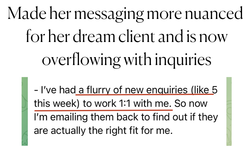 I want your brand to finally reflect who you are now so your offers sell without force, your content feels natural and fun to create, and the clients who step into your world are a true match for your depth and leadership.